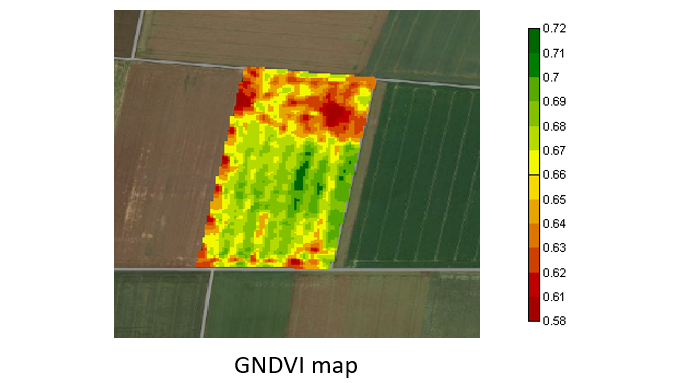 GNDVI basically replaces the red piece of standard NDVI collection with a very specific band of light in the green range to obtain different useful information. GNDVI is more sensitive to the variation of chlorophyll content in the crop.