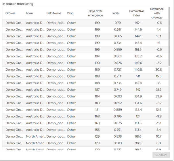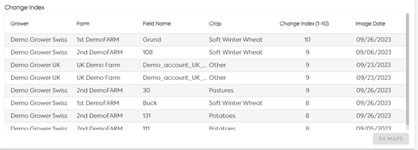 - Provides a 0-10 score indicating the level of change within the field using medium resolution imagery