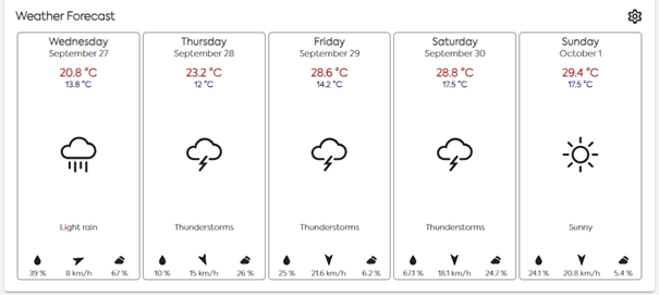 Weather Forecast for the next 5 days. Preferred location can be changed clicking on the top right bottom of the widget.