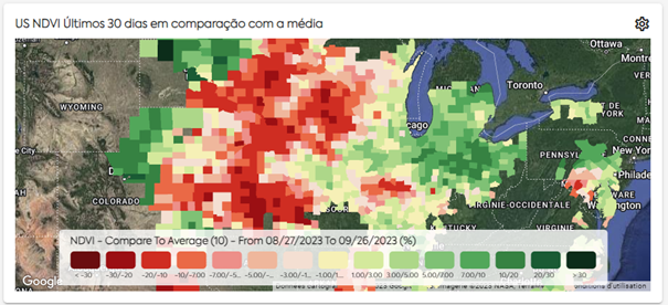 The user can select the favorite he wants to visualize. Here is the comparison of the last 10 days of NDVI compared to the last 15 years average.