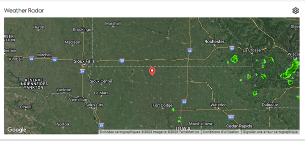 Weather radar displays the risk of rainfall. Preferred location can be changed clicking on the Settings at the top of the widget.
