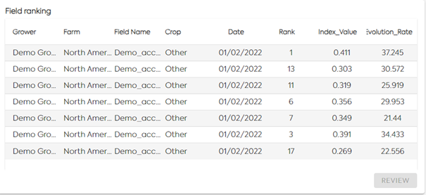- Field ranking based on the biomass level derived from vegetation indicator (Index Value)