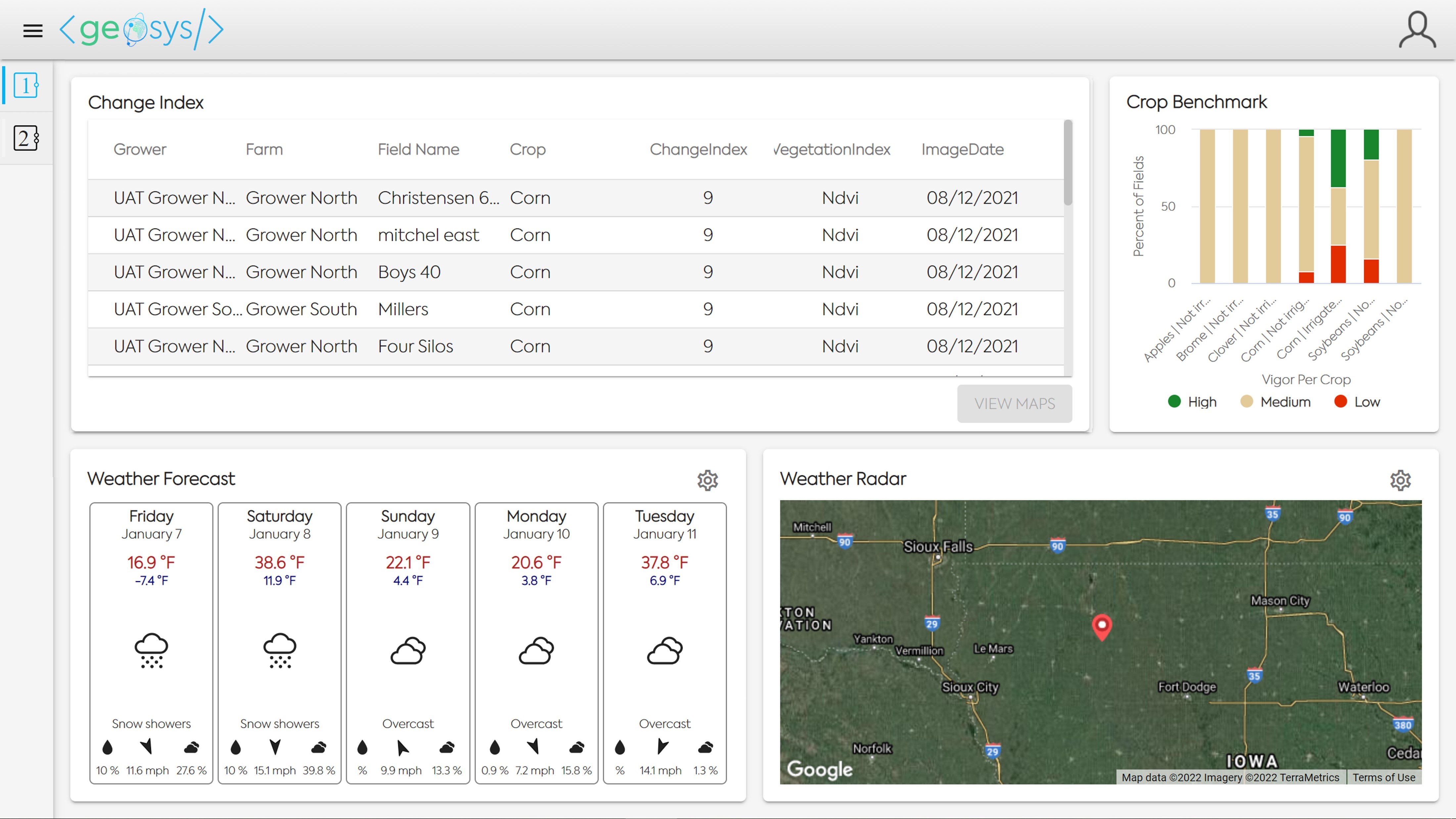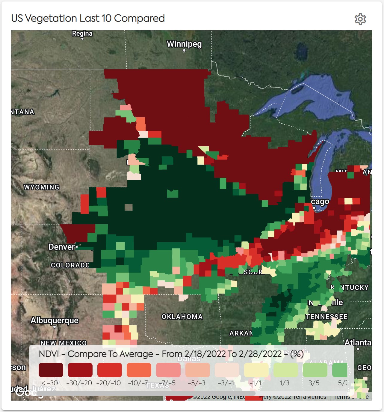 - Vigor Indicator shows the level of development of the crop based on current vegetation status : green is above average / yellow is on the average / red is below average.