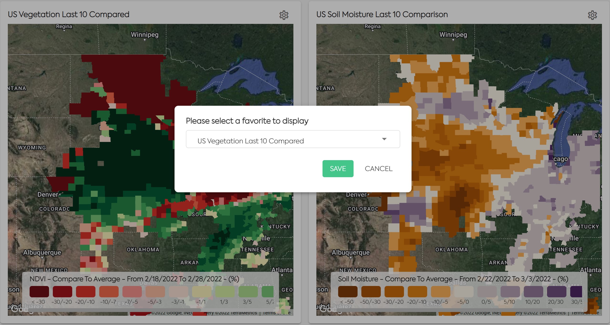 To change the map displayed, click on the Settings icon in the top right of the Favorite Regional Monitoring Map widget. Then you will be able to see a list of all your Favorite Regional Monitoring Maps. You can create more Favorites in the Monitoring module.