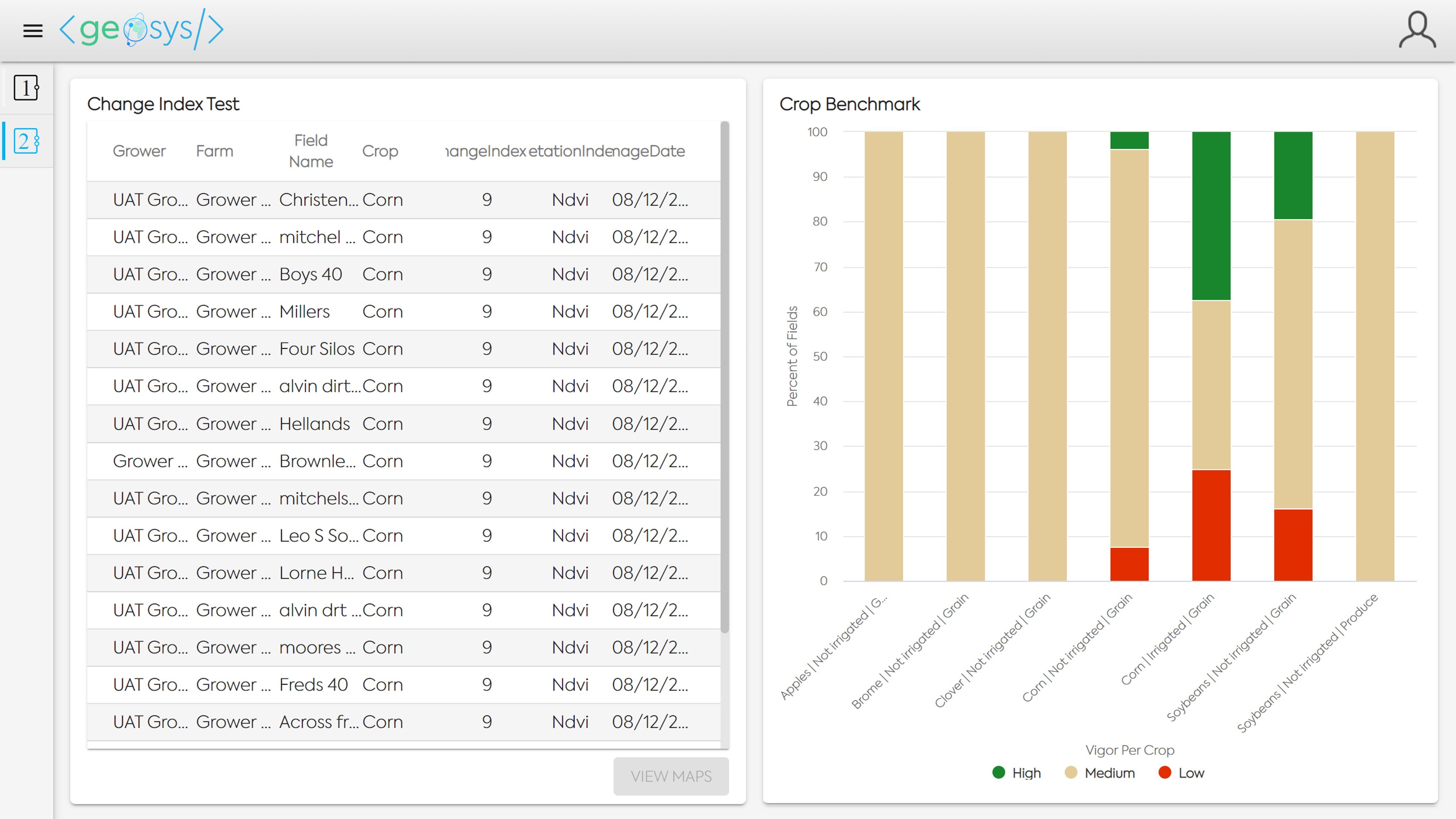 In the example below, clicking on the "View Maps" button will open the Map Analysis module with the two images used to create the Change Index value displayed in the table.