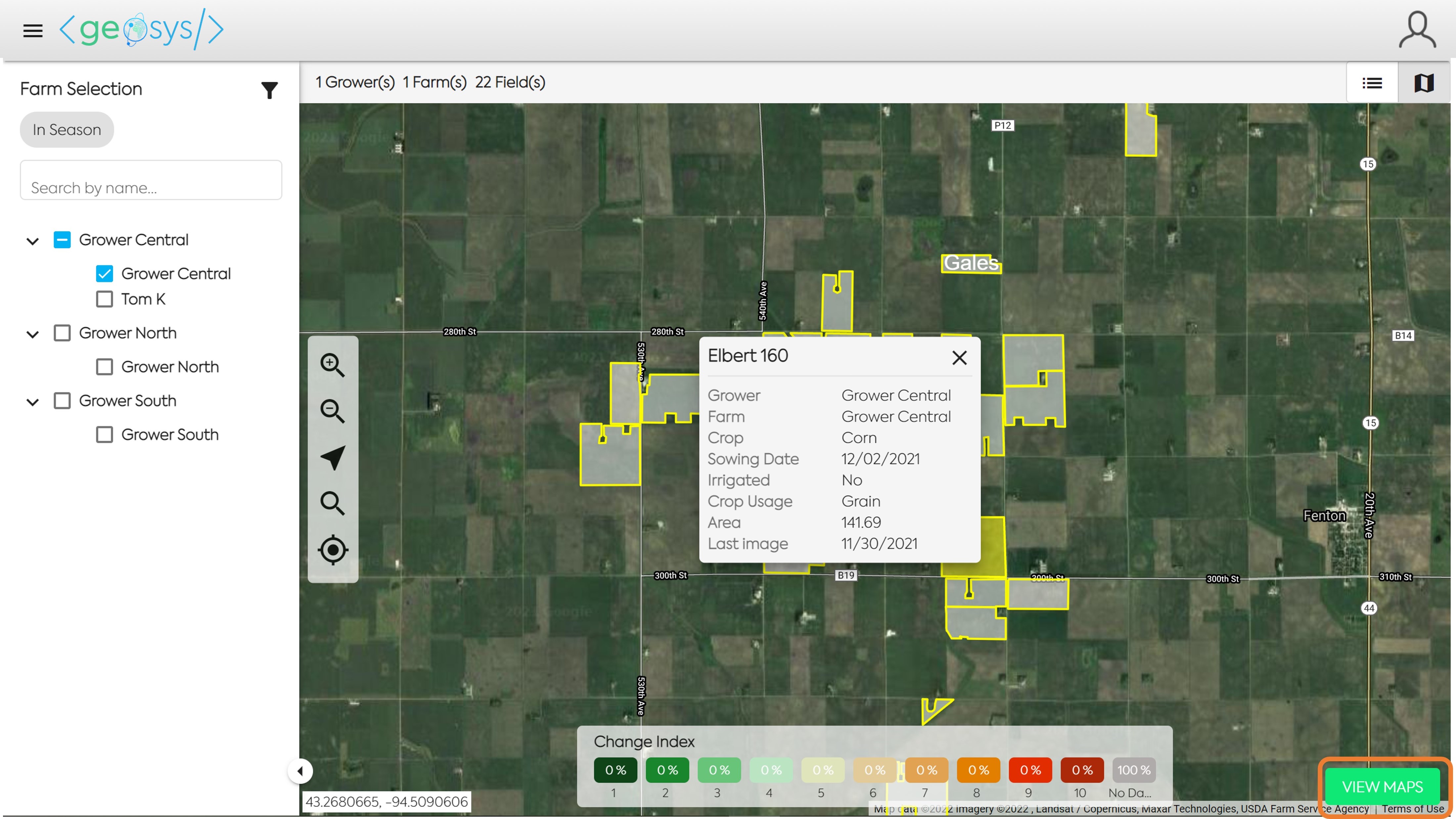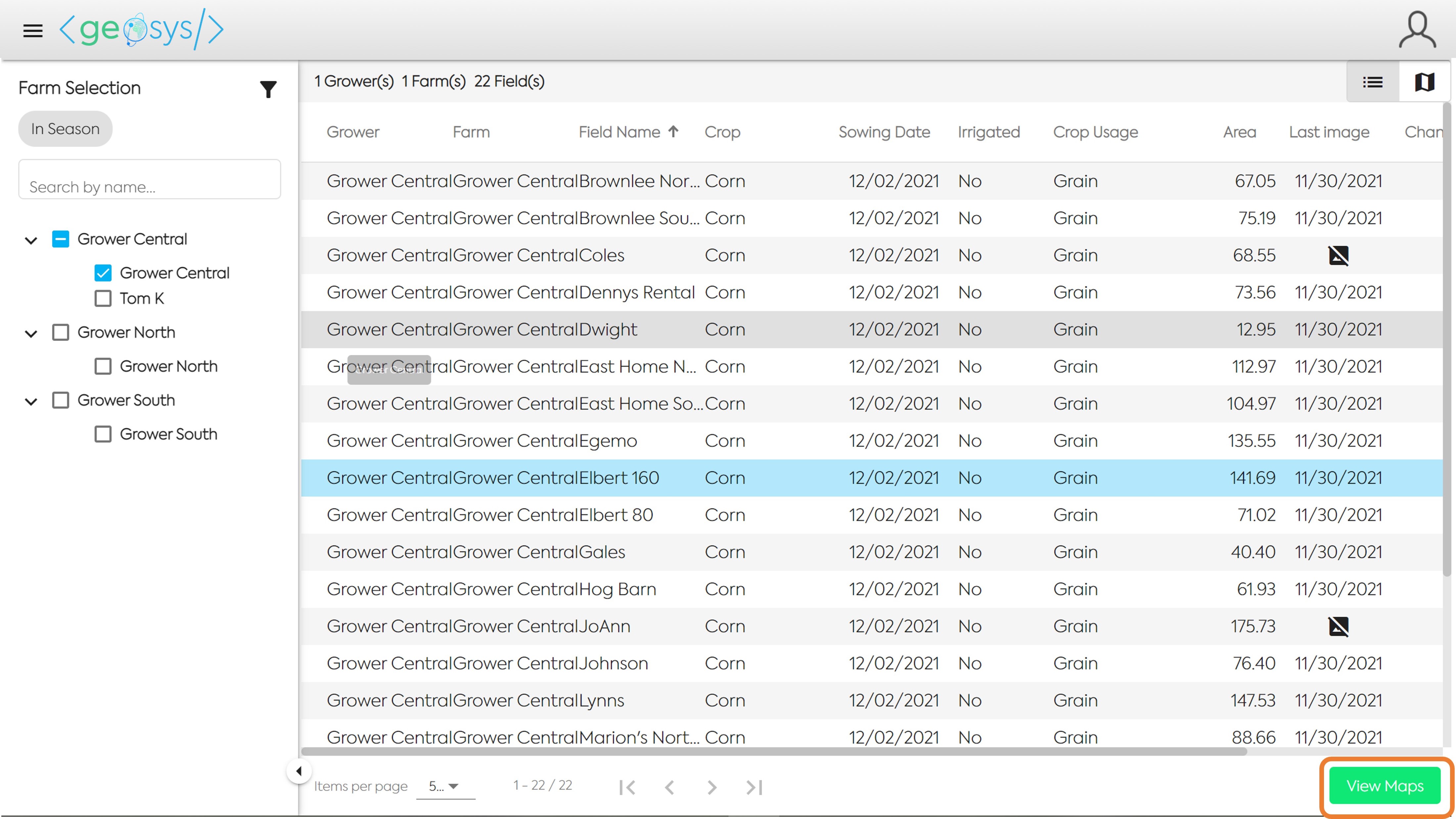 Select a field and click the View Maps button in the bottom right of the screen to access all the maps available for this individual field.