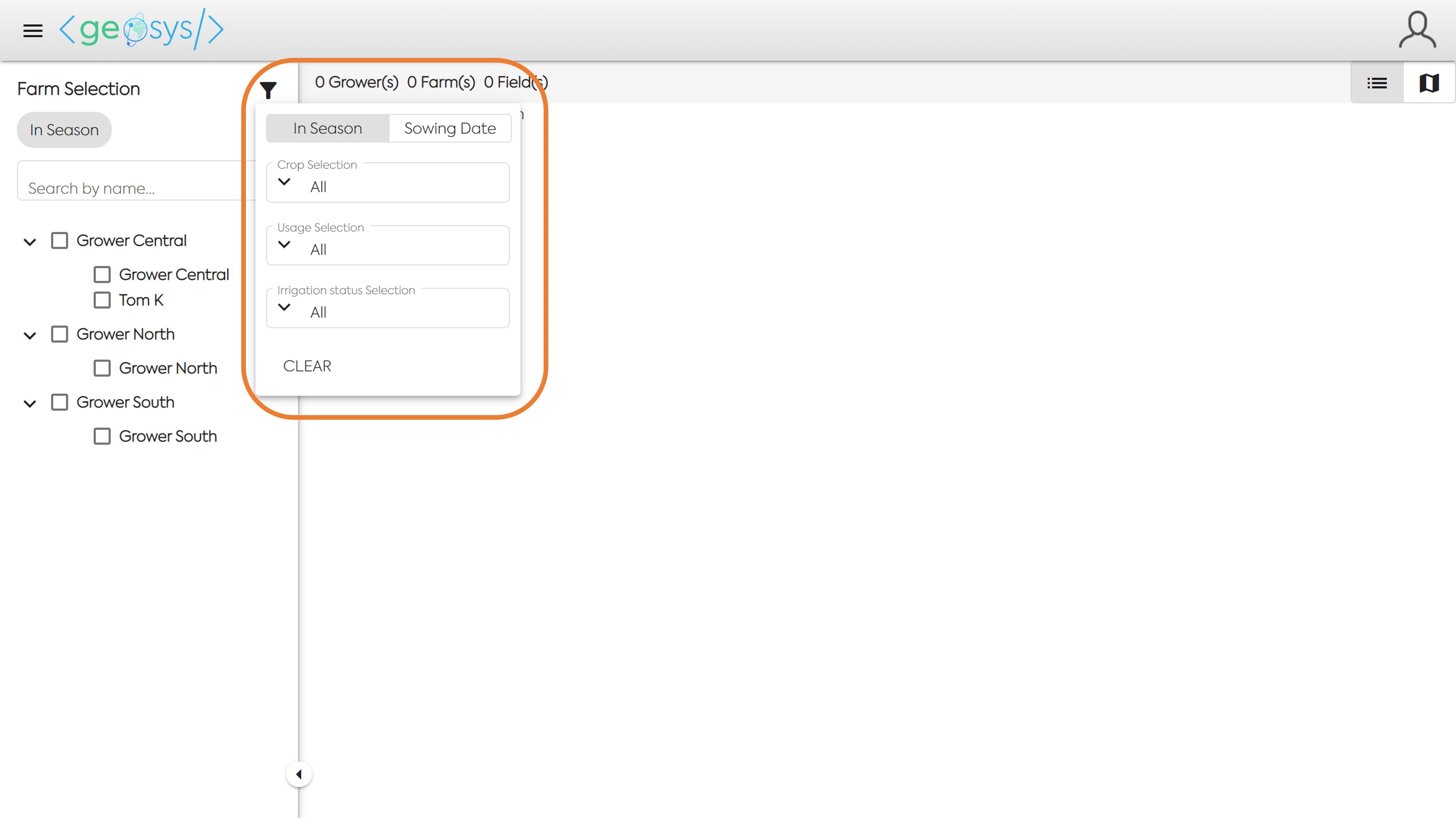 Click on the Filter Icon to view and choose your Grower, Farm, or Field based on In-Season or Sowing Date range, Crop Type, Usage and/or Irrigation Status.