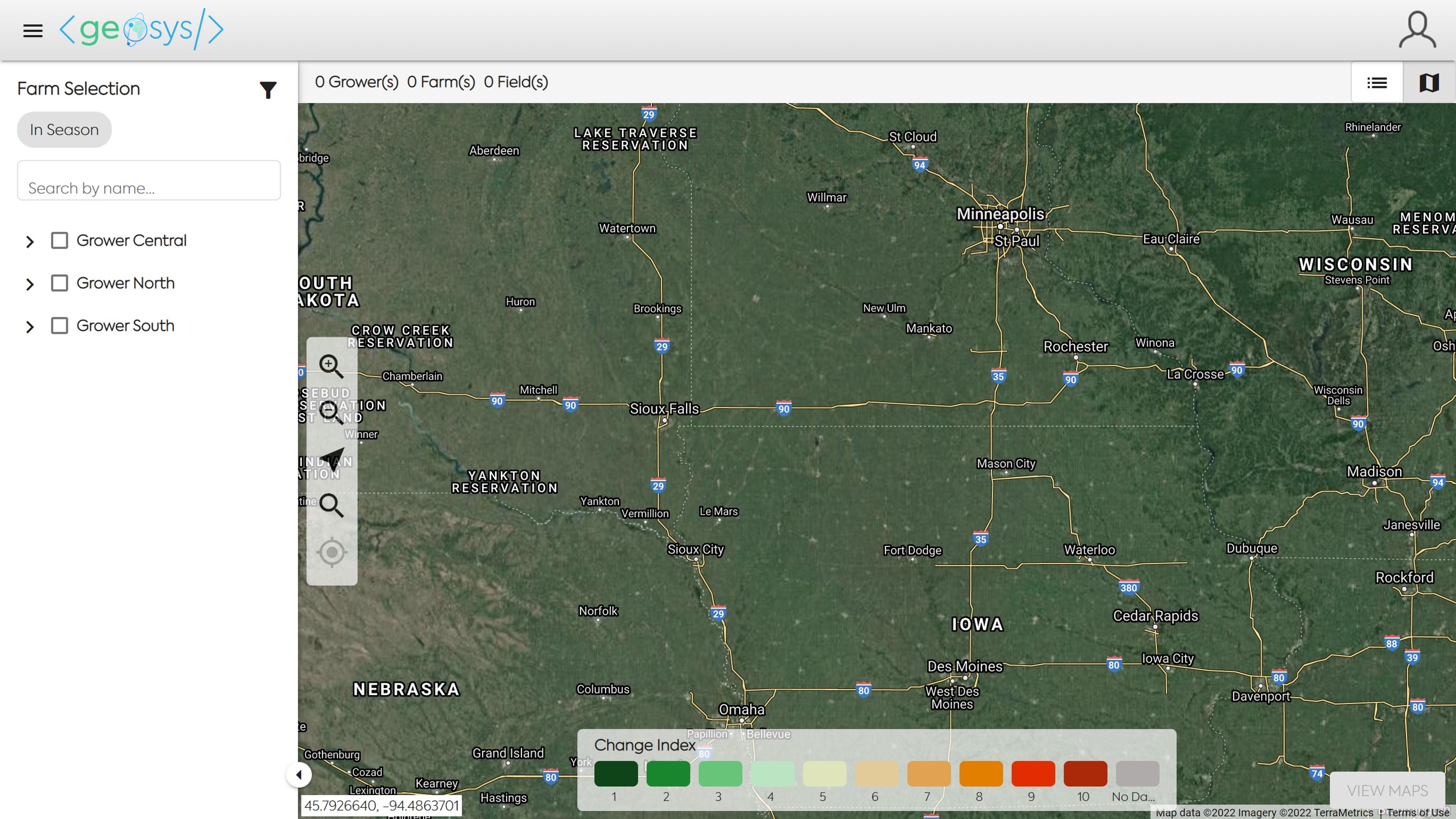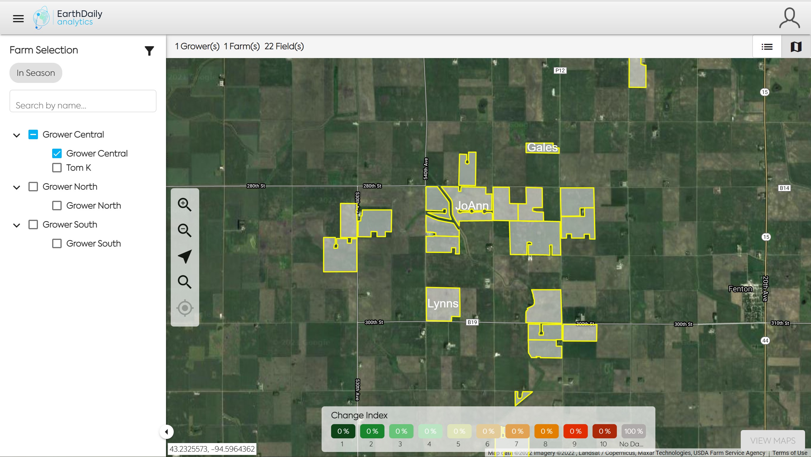 Select one or many Growers/Farms to view their fields in either a Map or Grid view. To toggle between the two views click on the map or list icon in the top right of the screen.