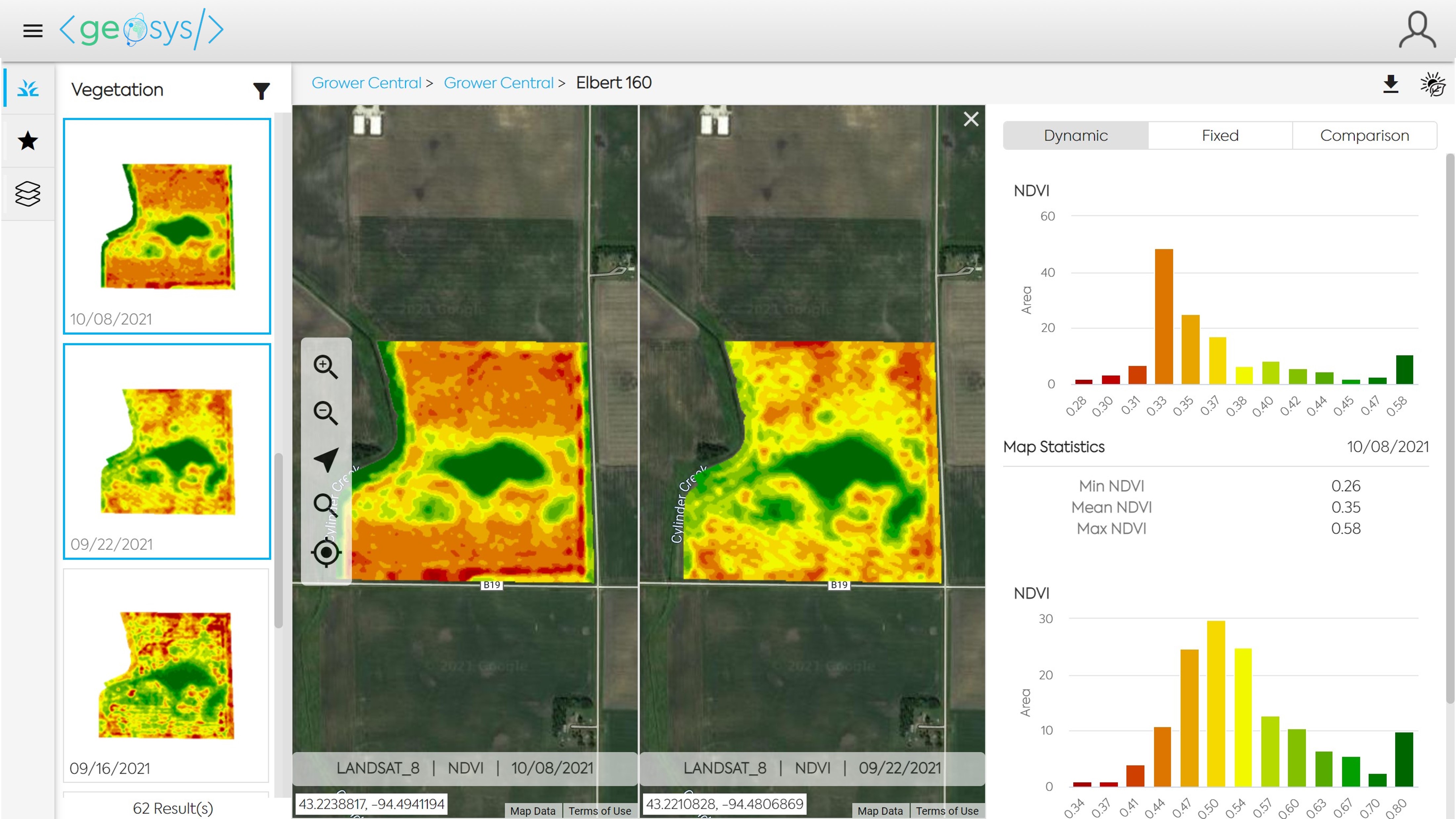 Select a Vegetation Map buy clicking on the map thumbnail in the left panel. To change the legend used for the maps you can toggle between the sensor options on the top of the right panel.