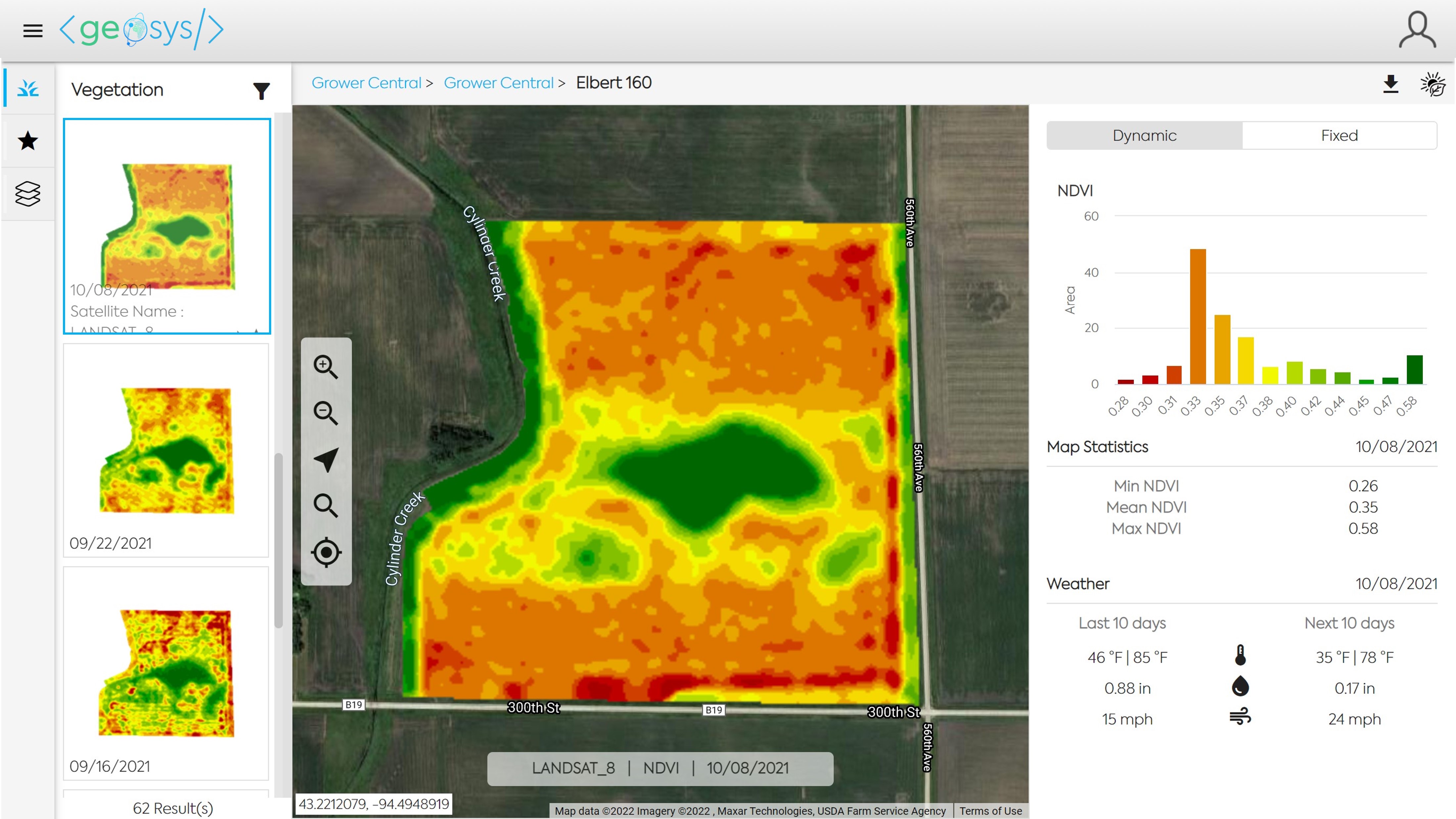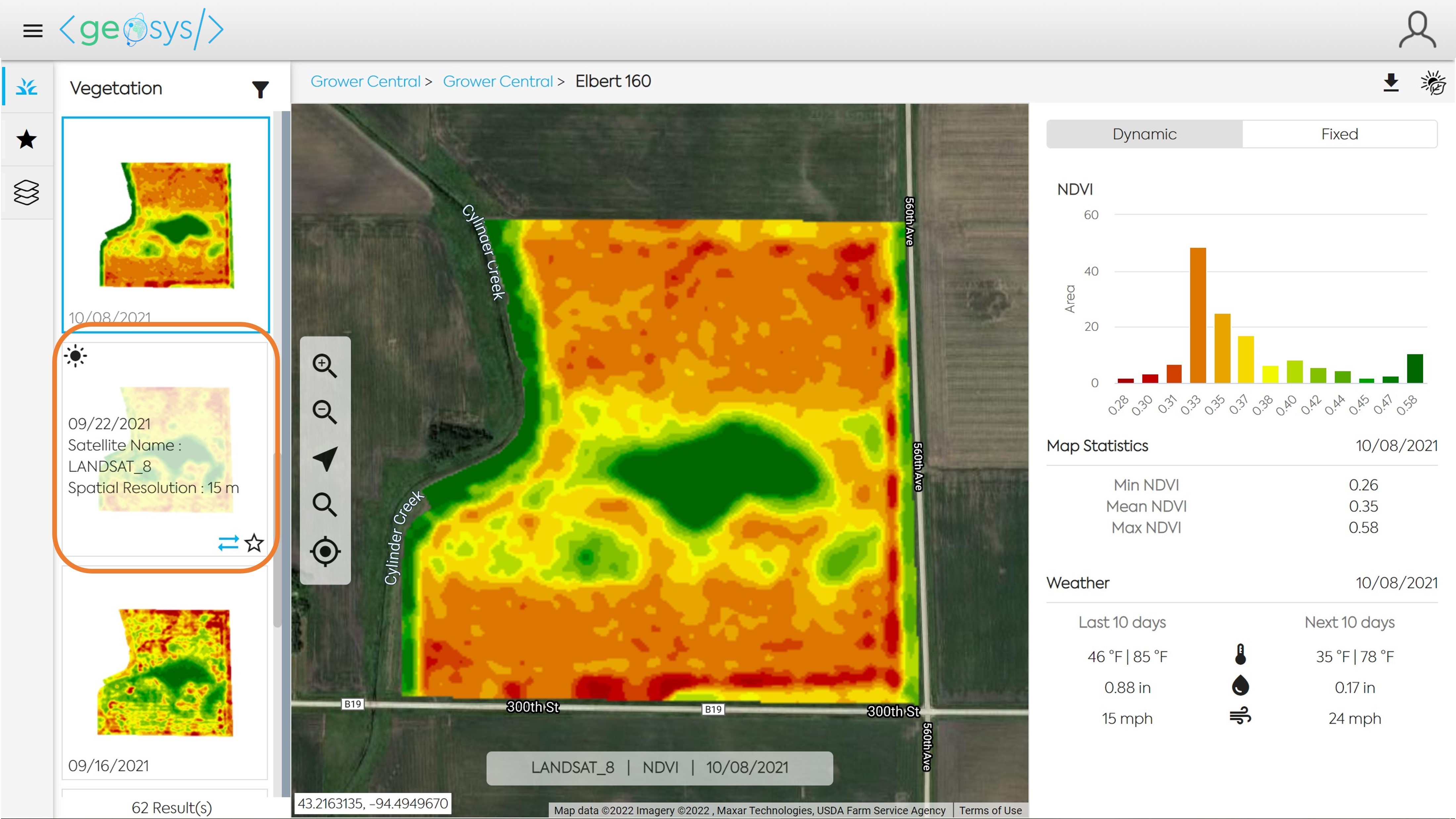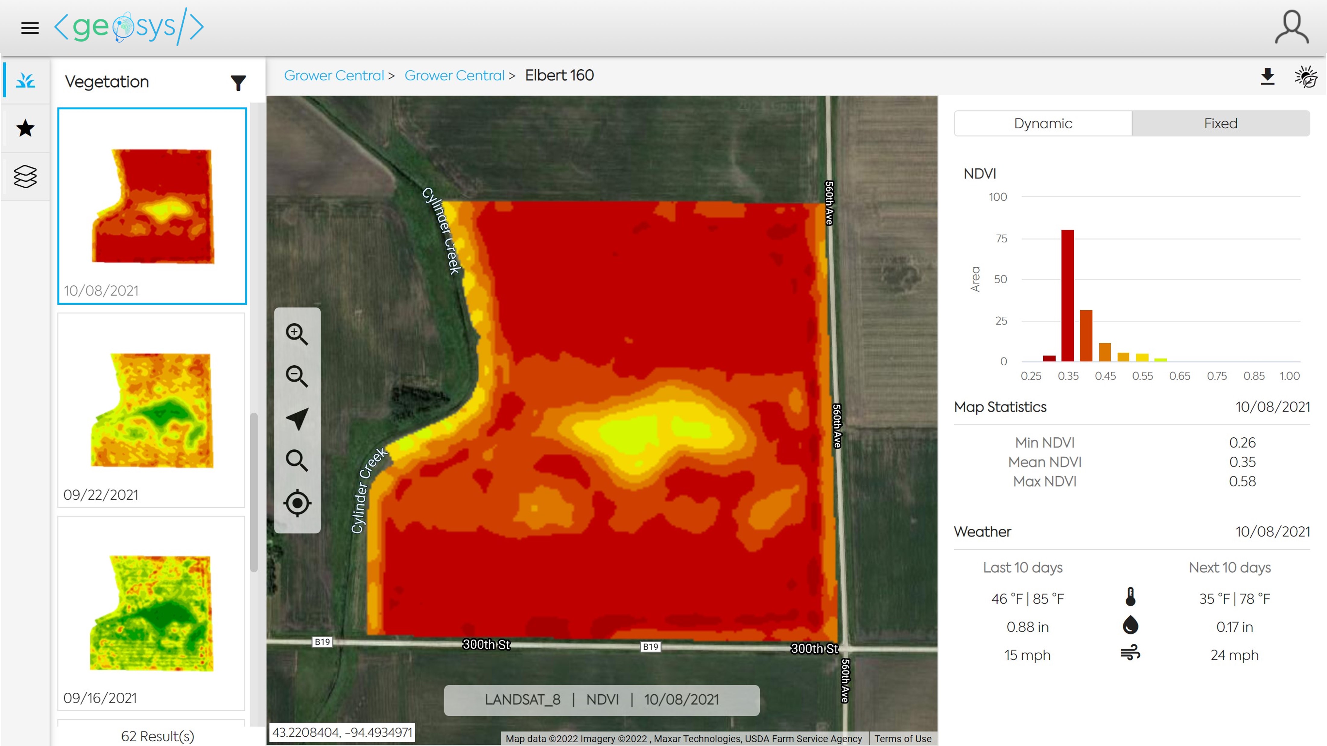 When viewing the Map Analysis Module, you first need to select the Field you would like to view. In Map Analysis, the selection panel will by default display all Growers/Farms which have a field in-season.