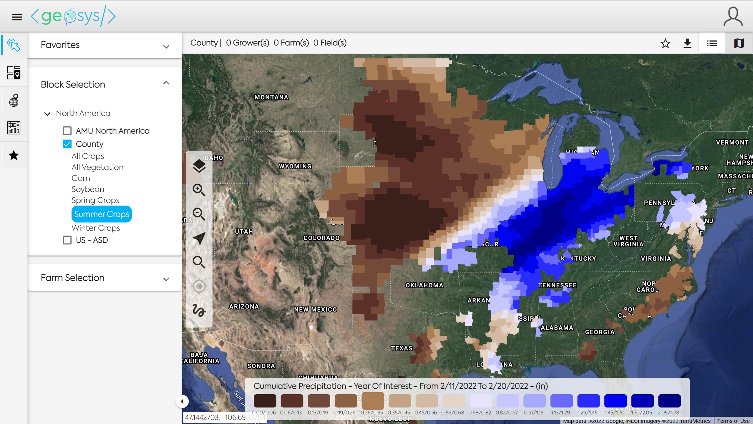Click on one or more entities and it will open the Time Series Viewer panel. You may select one entity by clicking on it, or multiple entities by using the lasso in the map navigation menu (freeform line tool at the bottom). Click on the Years on the right side of the panel to add more curves. The color of the year selected will correspond to the color of the curve. Click on the date calendars at the top of the panel to adjust the Start and End Dates of the Time Series.