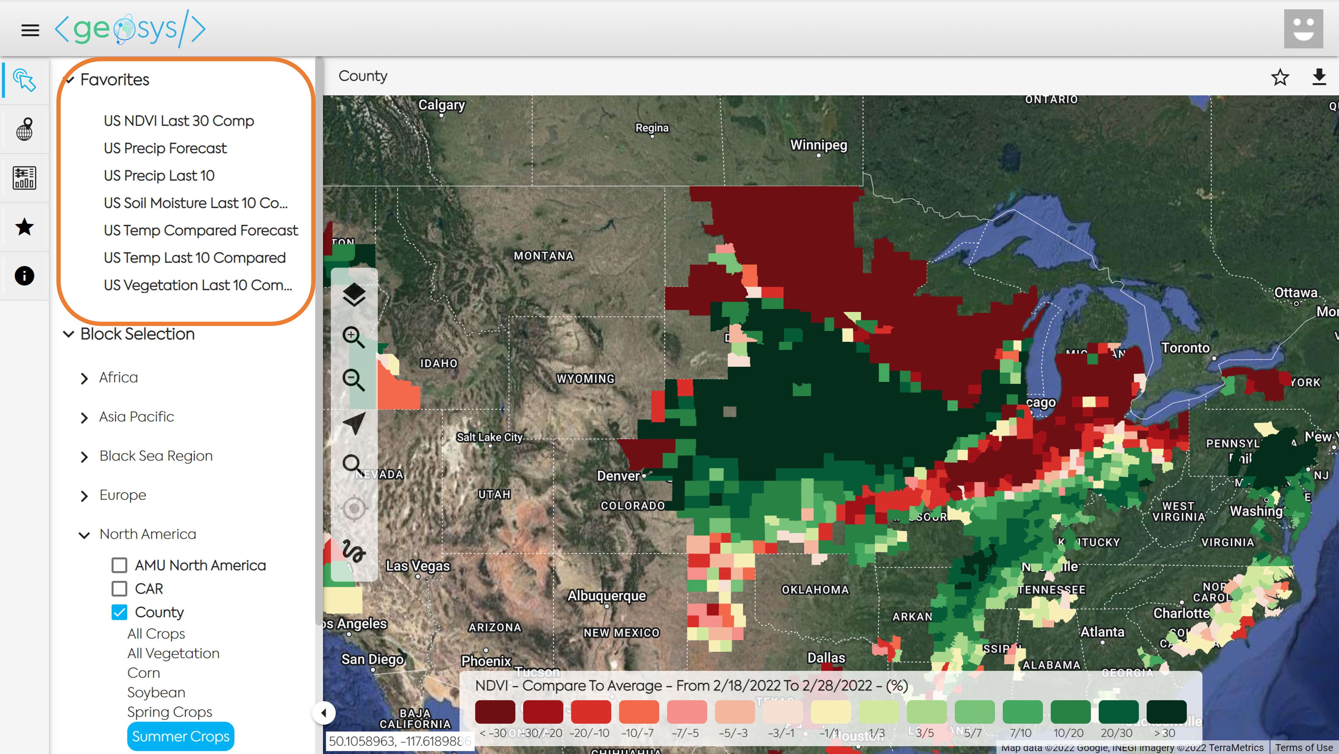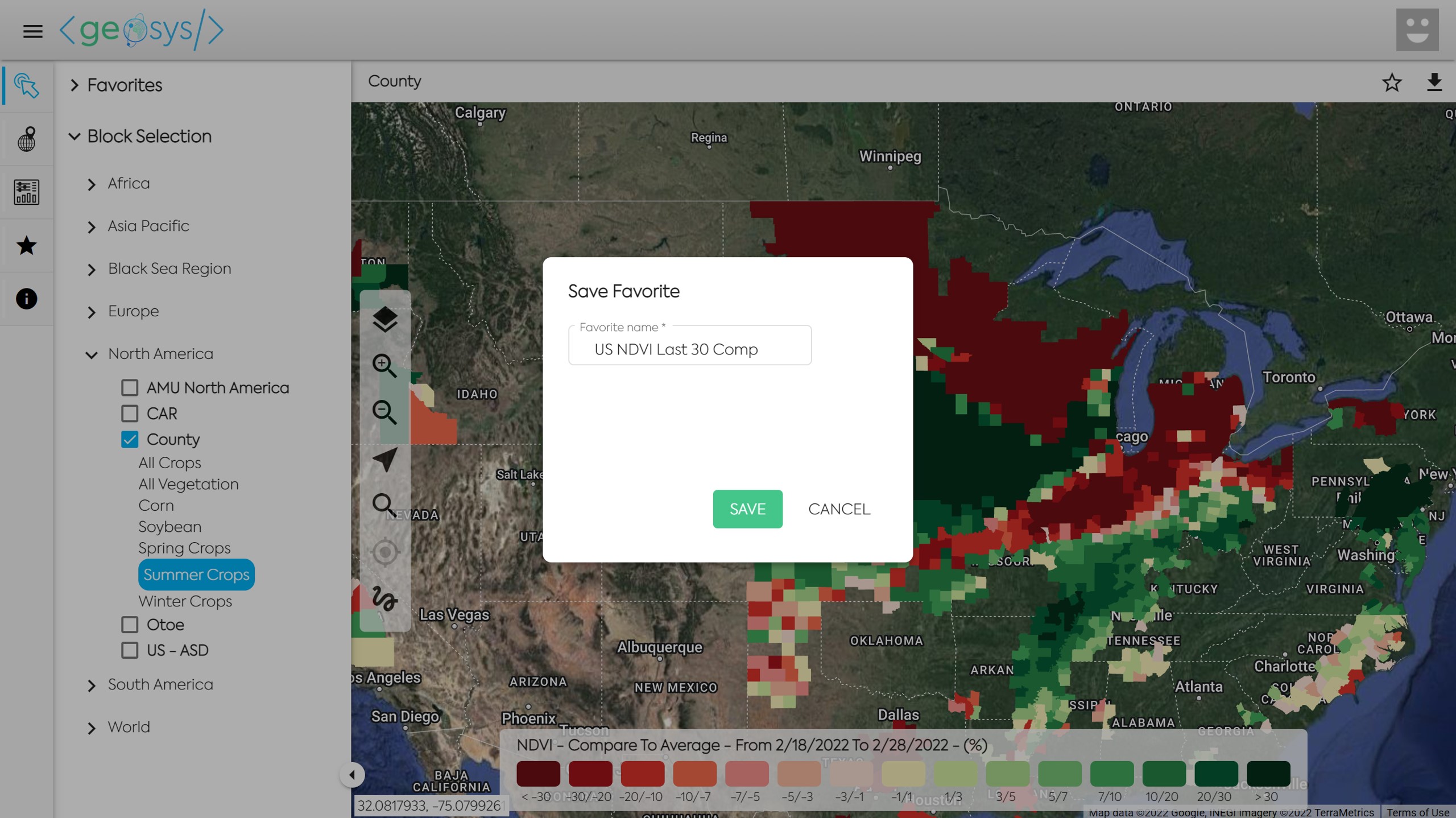 If you have a Regional Monitoring Map that you frequently visit you can save it as a Favorite so you do not need to select the Block, Mask and Analytic information each time you want to access the map. Once you have created the map you will need to click on the Star icon located in the top right of the screen.