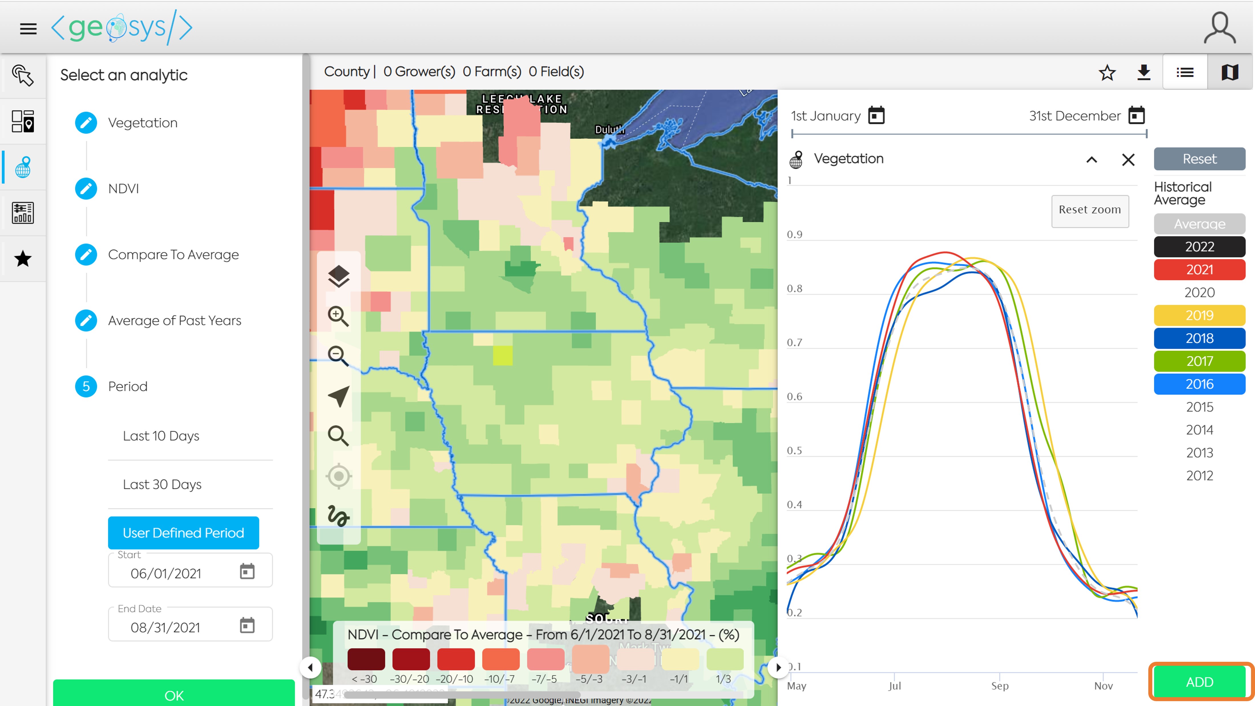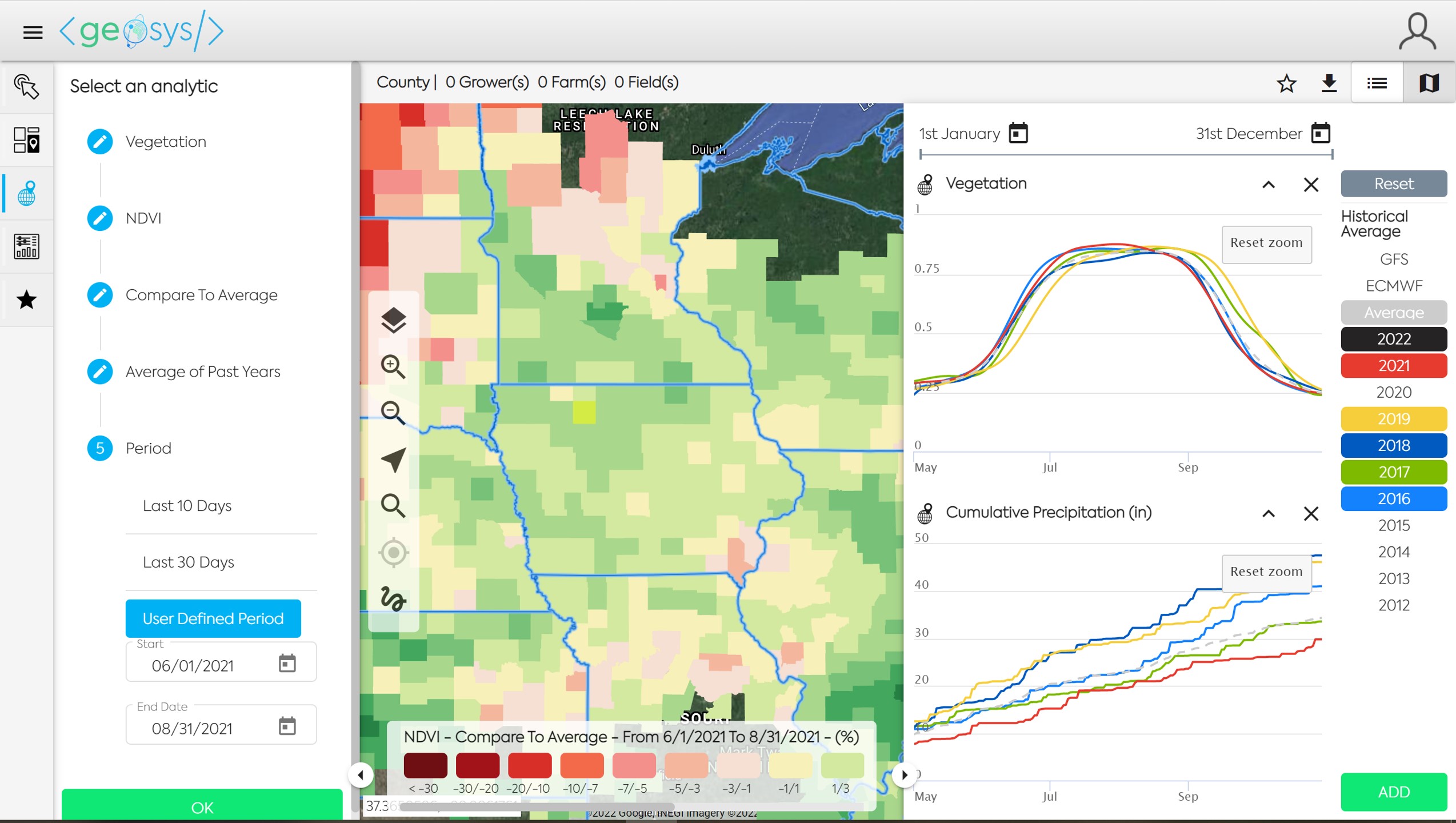 Click on one or more entities and it will open the Time Series Viewer panel. You may select one entity by clicking on it, or multiple entities by using the lasso in the map navigation menu (freeform line tool at the bottom). Click on the Years on the right side of the panel to add more curves. The color of the year selected will correspond to the color of the curve. Click on the date calendars at the top of the panel to adjust the Start and End Dates of the Time Series.